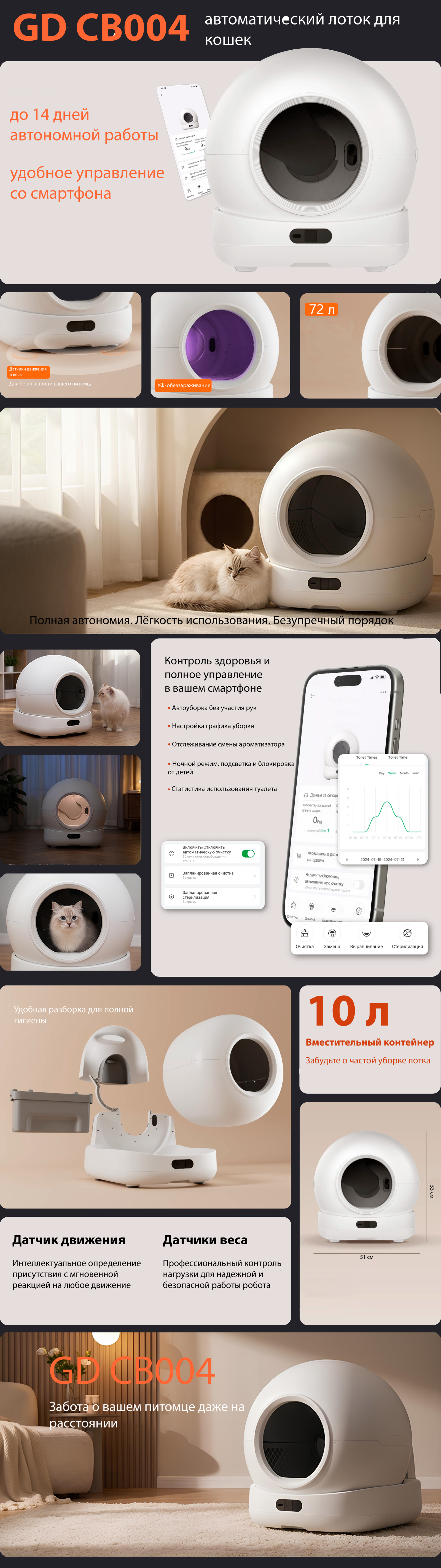 Автоматический лоток GD CB004 серый — это интеллектуальное устройство для ухода за кошками, которое объединяет безупречную чистоту, максимальную безопасность и комфорт вашего питомца. Система полной автоматической самоочистки с вращающимся барабаном избавляет владельцев от ежедневной уборки, обеспечивая гигиену в доме и здоровье кошки.