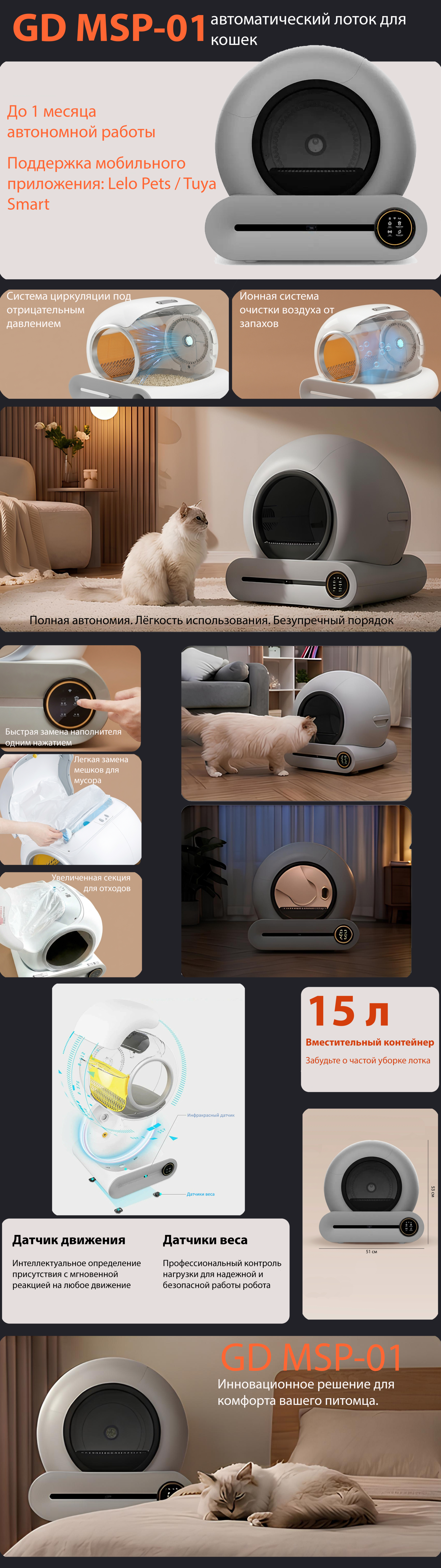 GD MSP-01 Gray — идеальный выбор для владельцев, ценящих безупречную чистоту, современный функционал и заботу о питомце. Умная система избавляет от рутины и делает уход за кошкой простым и технологичным.